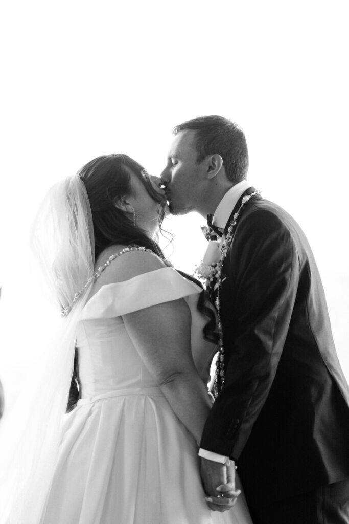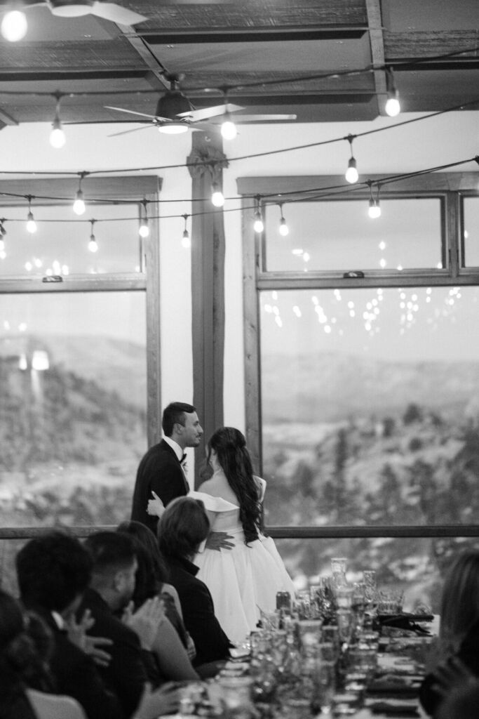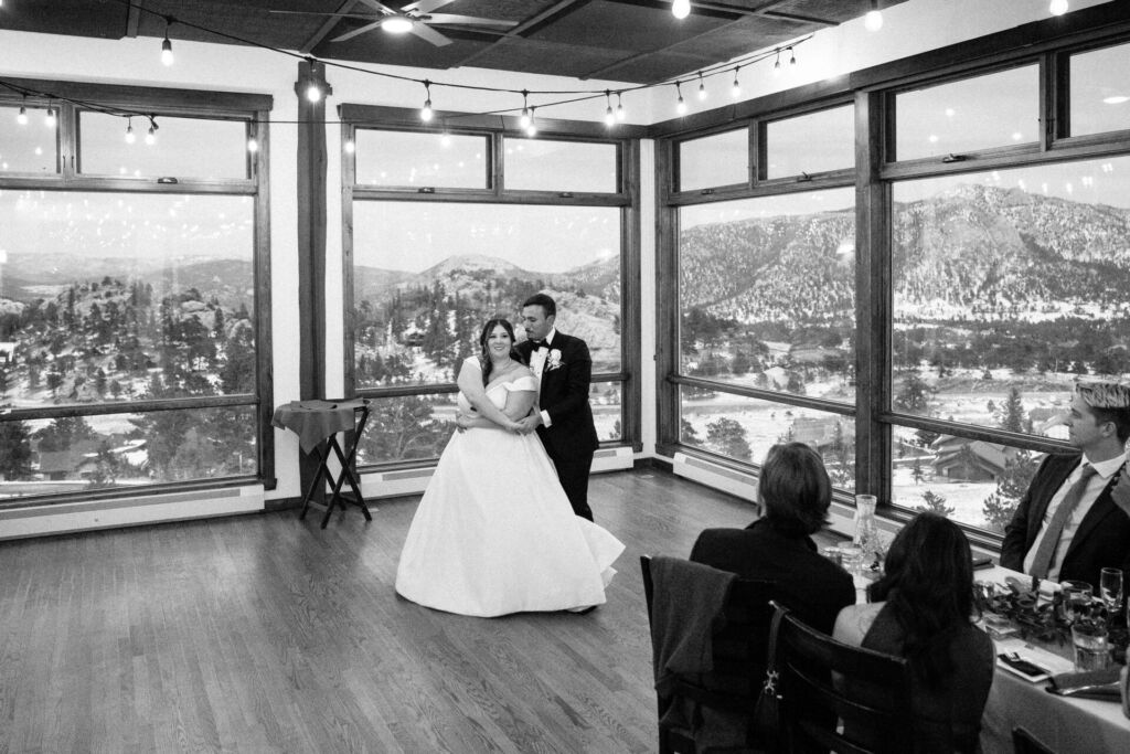The couple exchanged vows in Taharaa’s Overlook Room, a space known for its sweeping panoramic views of the Rocky Mountains. Framed by snow-dusted peaks and glowing winter light, the ceremony felt warm and inviting, offering the perfect balance of elegance and coziness that winter weddings are known for. With the mountains standing watch just beyond the windows, the setting felt deeply connected to the natural beauty of Estes Park. Photographed by Nick Sparks.