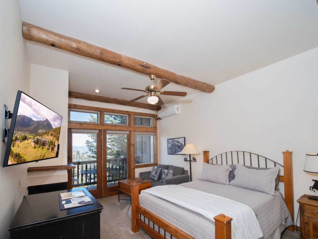 Featuring a Colonial-style queen bed and a comfortable loveseat, this room also includes an attractive fireplace, a private viewing deck with spectacular views of the Estes Valley.